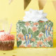This gift wrap features a watercolor portrait of blue macaws in a lush jungle scene and pink flowers.