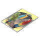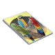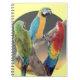 Photograph in vivid colours of a Military Macaw, Blue and Gold Macaw and a Scarlet Macaw all perched together on a tree branch forming a triangle.