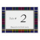 Elegant wedding reception table number tent card, done with the MacBeth clan tartan plaid as a background. A white text area, in the middle is surrounded by a pewter looking frame. Personalise the number and text for each table, at your reception.