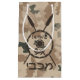 A military brown "subdued" style depiction of a Maccabee's shield and two spears on a desert camo background. The shield is adorned by a lion and text reading "Yisrael" (Israel) in the Paleo-Hebrew alphabet. Modern Hebrew text reading "Maccabee" also appears.