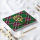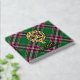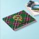 Clan MacFarlane crest badge surrounded by a strap and buckle over modern hunting tartan background. Custom front, back and spine text.