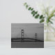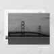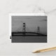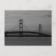 Postcard featuring a late sunset black and white photo of Mackinac Bridge from Mackinaw City, Michigan. The bridge is a suspension bridge spanning the Straits of Mackinac to connect the Upper and Lower Peninsulas of the