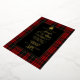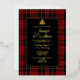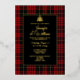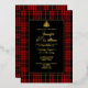 Classic red, black and yellow Scottish clan MacQueen plaid and foil wedding invitation, with a decorative black text area. A foil Celtic knot heart decorates the top of the text area. Personalise the text for your highland wedding.