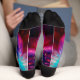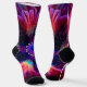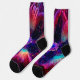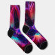 This pair of Radiant Riot socks features intense magenta petals blooming from a deep midnight blue starry center. Each sock presents the vibrant, jeweled artwork as a complete statement. A fusion of vintage botanical inspiration and AI imagination