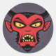 Cartoon illustration of a mean red devil character with horns, goatee, yellow eyes and fangs.