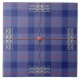 We call the original design by HomeWare on this large Ceramic Tile “Mad Plaid in Blue”. The pattern is a basic plaid in shades of heather blue. Over this background are two wavy red lines, one horizontal and one vertical, which cross through the centre of the design. The lines are three dimensional, throwing shadows on the plaid, and there is a round red button in the centre, where the lines intersect. Over the far ends of the red lines, on four sides, there are blocks of textured, wavy white lines. There are also red dotted lines running through the lighter blue part of the plaid. It looks a bit like a package, all sealed and taped. Thus the name "Mad Plaid in Blue".