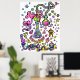 Bright colourful test tubes and beakers brewing up some mad science, with bubbles that look like eyeballs, flames turning into little monsters, clouds of steam growing tentacles, and other fun details that any mad scientist would love. Art by Marianne O