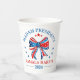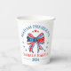 Madam President Kamala Harris 2024 election paper cups for democrats and Kamala supporters - with patriotic red, white and blue coquette bow ribbon and stars.