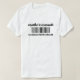 WHITE SHIRT WITH BLACK LETTERING,MADE IN HAWAII AT THE TOP WITH A BAR CODE ACOSS THE CENTER. THE BOTTOM SAYS "UNODAKINE12B4LOCALSONLY" YOU HAVE TO LIVE THERE TO UNDERSTAND!