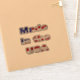 Custom-cut vinyl sticker with an image of the phrase “Made in the USA” in bold American flag letters. See matching round sticker, confetti, favour bag, favour tag, label and wrapping paper. See the entire Patriotic 40s Sticker collection in the INVITES | Stickers & Labels section.