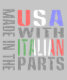 Humorous image reads, MADE IN THE USA WITH ITALIAN PARTS. Letters have a textures look to them, with "Italian" in green, white and red. "USA" shows in red, white and blue.
