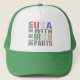 Reads, in edgy-looking lettering, MADE IN THE USA WITH IRISH PARTS. USA shows in red, white and blue letters. Irish shows in green, white and orange. Choose from several hat colors, this one shows in green.
