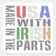 Reads, in edgy-looking lettering, MADE IN THE USA WITH IRISH PARTS. USA shows in red, white and blue letters. Irish shows in green, white and orange.