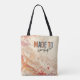 Tote bag depicts an abstract watercolor background with old music sheets. It features an inspirational Christian quote, "Made to Worship."