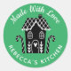 A personalised "made with love" sticker featuring a cute little gingerbread house with a heart and the words, made with love on a green coloured background. Personalise it by adding your own name. A pretty finishing touch for all of your homemade gifts. Designed for you by Blackberry Boulevard.