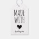 Paper hang tags for your handmade items where you can add your name and washing instructions. Made with love is written in a large hand-written font where a doodled black heart replaces the word love. Your name in a charming script.