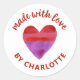 A personalised "Made with love" sticker with a painted red and purple heart on a white coloured background. Make it yours by adding your own name. A pretty finishing touch for all of your handmade gifts. Designed for you by Blackberry Boulevard.