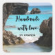Handmade with love stickers with a scenic photograph featuring Bermuda's tropical coast. Big jagged rocks contrast with the bright turquoise sea.