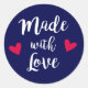 A sticker featuring the words 'made with love' written in white brush script on a navy blue with two red love hearts. You can change the background colour to whatever suits your item but it looks particularly good on dark blues and purple, black or brown. This would be perfect for anybody giving DIY or homemade gifts to friends and family or for anybody who wants to decorate their products with a sticker to show it's been handmade.