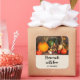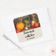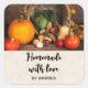 Made with love product stickers with a photograph of a thanksgiving harvest, set on a rustic wooden table. Pumpkin, potatoes, squash etc... make up this bountiful collection of food. Colourful autumn leaves surround the cornucopia basket.