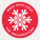 A simple red and white snowflake sticker with the greeting, Made with love. Personalise it with your family name. Fun for your homemade or handmade Christmas neighbour treats and gifts. Designed for you by Blackberry Boulevard.