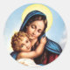 This gorgeous Madonna and Child depiction is one of our personal favourites. The beautiful Virgin Mary has a halo and is dressed in blue and red robes. The Christ child is seated on the Virgin Mother’s lap and has his arm around her. He has a little halo of his own. Behind them are blue skies and clouds. A truly special Madonna and child sticker.
