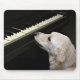 yellow labrador retriever looking longingly at an old piano