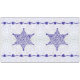 This tablecloth has the classic bell-and-pomegranate motif in blue with leaves and a Star of David.