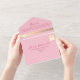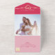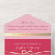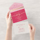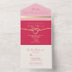 This bold and modern all-in-one wedding invitation features a stunning magenta and blush palette, a romantic heart ribbon illustration, and a detachable RSVP card for added convenience. The back includes space for a large photo and a printed return address, making it a stylish option. Perfect for couples seeking a vibrant, coordinated design with built-in practicality. Fully editable and ideal for summer weddings or modern romantic celebrations.