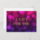 Gift Certificate card featuring the words "A Gift For You" in faux gold foil against a magenta bokeh lights pattern background on the front.