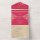 An elegant all-in-one wedding invitation featuring a vibrant magenta background with delicate gold floral illustrations, romantic script accents, and a detachable gold RSVP postcard for guest convenience. The back includes a large photo section and a return address printed at the bottom of the RSVP card for easy mail-back. Please note: This invitation is not an envelope and will require a separate A9 envelope for mailing. Ideal for couples seeking a stylish, practical solution for summer, multicultural, or romantic weddings with a bold colour palette.