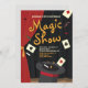 The card features a magician top hat with a magic wand and playing cards flying in the air. The card also has stage curtains on the side, so that your child’s name and details can be printed on the inside.