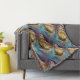 A quality printed throw has its advantages. This is a much finer weave throw than its loopier cousins, and though lighter, it is worth the investment for custom room accessorizing. The back is much prettier than the typical brown, and the fringe on the long sides very vivid, the selvage nicely done. Before photographing, I washed the throw in cold water, delicate, with a thicker woven throw the same size. On tumble dry low, this throw was dry in half the time as the other. This is a very practical quality if you use throws for furniture covers or to wrap up in frequently. The sleekness of the fabric makes it a great layer for accenting or protecting without the feeling of sitting on too much stuff. Perfect for napping or when you feel a light chill coming on. The color printing is beautiful and on this fabric, matched the design and color of my Photoshop image. This is an advantage for blending room fabrics and colors. The fringe on the short sides prints the colors from the design image and therefore varies from the side fringe. I streaked a white fractal line through the plaid pattern to give the illusion of weaving. This printed as crisp as an illusory thread, and put some white in the short side fringe, showing another advantage of print vs loomed- for artistic purposes, line lines, detail, and color integrity can be planned and preserved. My loomed throws have color limitations and more of a needlepoint texture. Print throws reproduce an exact image. The throw felt a little stiff straight out of the package, but this went away in the first delicate wash. Of course I searched the wash water for ink or bleeding and there was none.