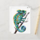 traditional watercolor and ink artwork of a chameleon in blue and green colours on a postcard