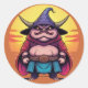 This design features a menacing mushroom wizard with a fierce expression, set against a vibrant sunset background. The character is adorned with a large, purple mushroom cap hat that has curved horns, adding to its intimidating look. It wears a red cloak that drapes over its shoulders and a blue tunic tied with a wide belt featuring a round buckle. The background showcases a picturesque sunset with orange and yellow hues, enhancing the dramatic effect of the design. The detailed illustration with bold lines and vibrant colours makes this design eye-catching and unique, perfect for fantasy and art enthusiasts.