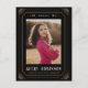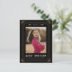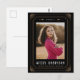 This 2023 graduation announcement card was inspired by tarot cards and features gold accents on a black background framing a photograph of the graduate. The graduate's name and school are displayed on the bottom of the card and the date is in Roman numerals along the top between celestial elements, further adding to the magical theme. The back is setup to be ready to mail as a postcard, a great budget option.