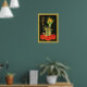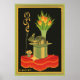 Vintage poster art called Magic featuring a rabbit out of a hat, tulips, smoking ashtray, four cards.