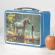 This is a standard metal lunchbox that appears to work just fine. We designed this box ourselves with an uploaded photo and custom text on the front and back. It looks absolutely beautiful except the front of the lunchbox is not centered like it shows in the photo. The print borders don't align with the inset flat part of the box where the preview photo online showed it perfectly centered in there. The back looks nice and centered though.