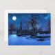 Snowy park with beautiful bridge over small pond, street light and covered in snow trees in winter in night. Beautiful winter night.