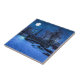 Snowy park with beautiful bridge over small pond, street light and covered in snow trees in winter in night. Beautiful winter night.