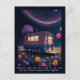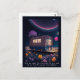 Whimsical postcard for book lovers features AI generated digital art dreamscape with a illuminated bookmobile in a field of flowers under a night sky. "Meet me under the stars and we can read all our favourite banned books together" text can be customised to your own special message