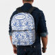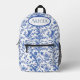 Fanciful birds fly among flowering branches in a blue flowering toile de jouy desgin on this beautiful backpack.