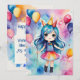 A vibrant digital illustration featuring a cheerful girl with long, flowing teal-blue hair, big expressive eyes, and a galaxy-inspired outfit. She wears a party crown with golden accents and holds a balloon in one hand as she smiles brightly. Her ombré dress blends shades of sunset pink, orange, and deep purple, and she's paired it with black high-top sneakers and a small orange bow tie. The background is a festive watercolor swirl of balloons, stars, and dreamy pastel hues, creating a magical celebration scene full of energy and fun.