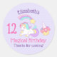 A birthday thank you sticker with a magical theme. Designed with an adorable white unicorn with pastel green, purple, yellow and pink curly mane and tale. This magical creature is laying down sleeping peacefully with a rainbow coloured shooting star flying over her head. A pink and yellow cupcake with a unicorn horn in the centre. Lilac and white polka dot background. Personalise with the birthday girl's name and age.