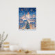 A festive Christmas cityscape illuminated by glowing fireworks and holiday lights. Snow gently falls over cosy buildings, capturing the warmth and wonder of a winter night celebration.