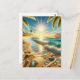 A beautiful magical coastline metal postcard. Pretty shoreline with ocean waves, palm trees, shells, starfish and sea glass.