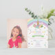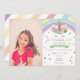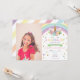 This is a unicorn and rainbow themed birthday party invitation w/ picture.