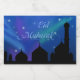 Eid Greeting illustration with a magical evening sky scene: silhouette of a mosque on a blue night sky with shiny stars.