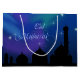 Eid Greeting illustration with a magical evening sky scene: silhouette of a mosque on a blue night sky with shiny stars and moon.