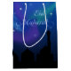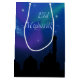 Eid Greeting illustration with a magical evening sky scene: silhouette of a mosque on a blue night sky with shiny stars.